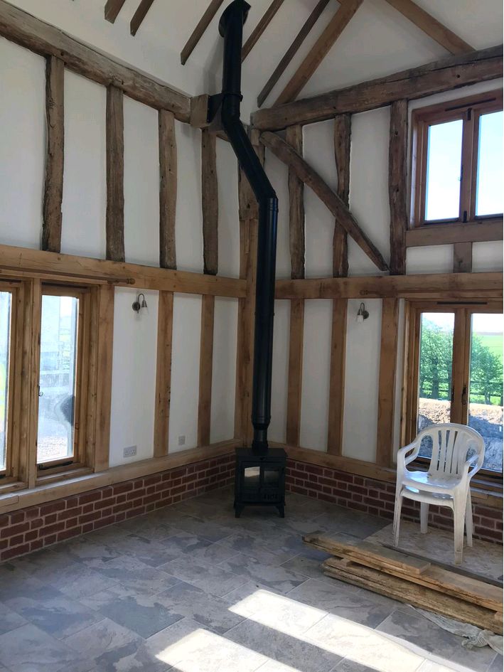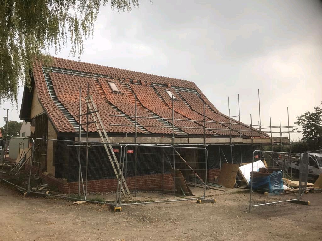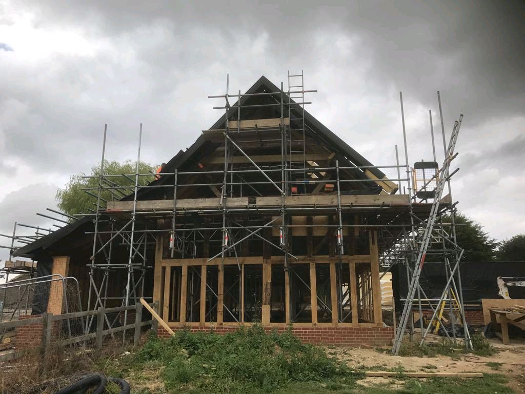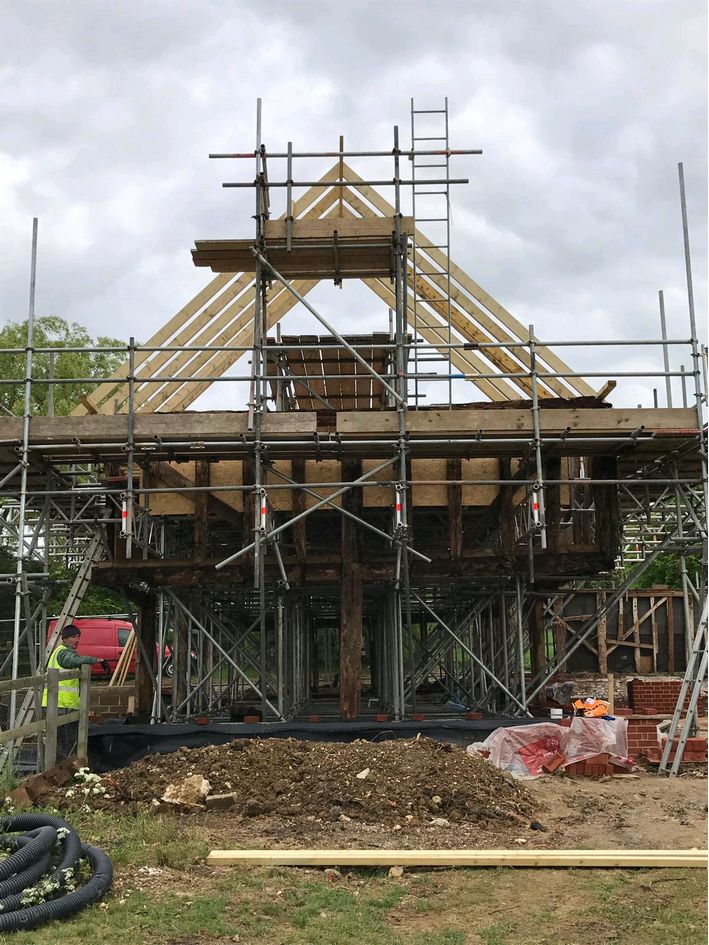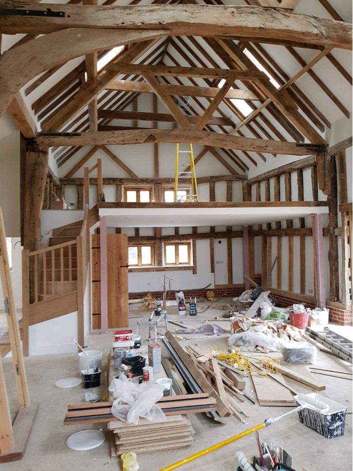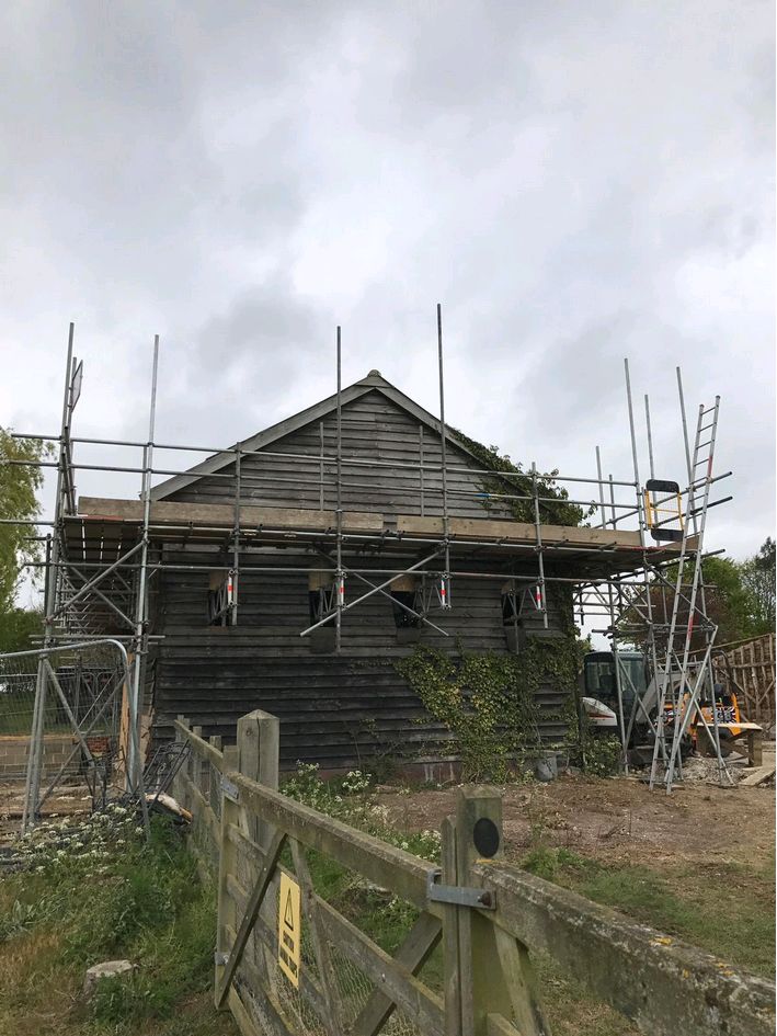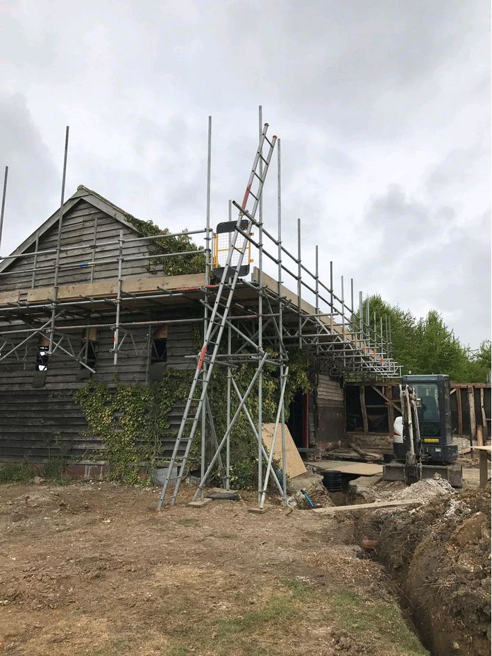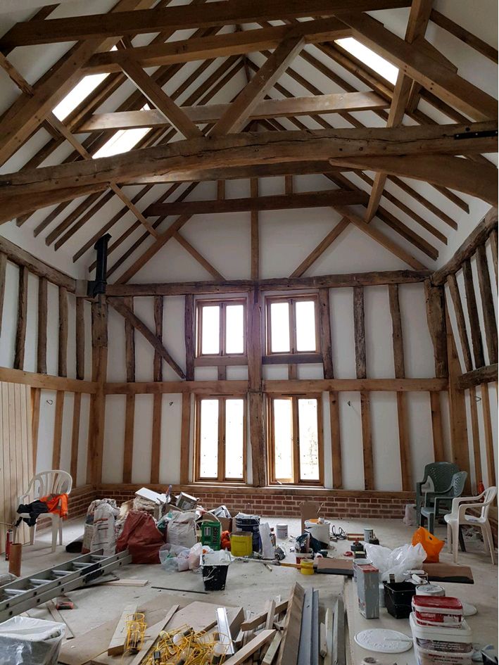 The entire old barn was stripped back and supported by scaffolding so the foundations of the main barn could be underpinned. The existing oak frame had the rot cut out and various bits replaced by our carpenters on site. We then carried out all work from the ground works through to final decorations and landscaping.